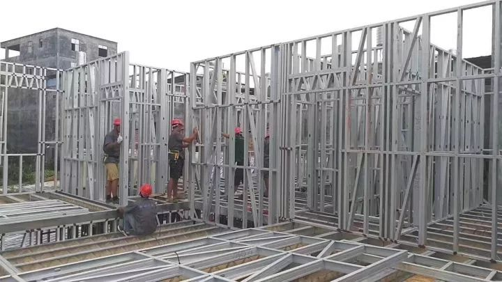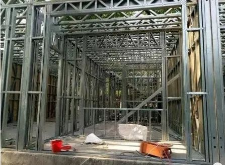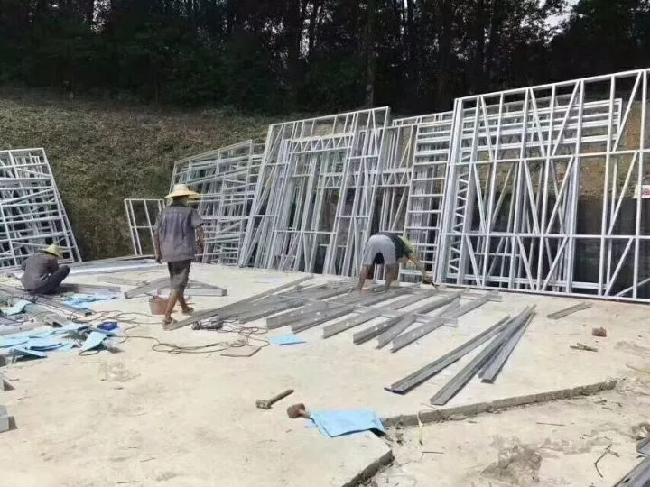 在平整地基上做防水處理后安裝龍骨架,輕鋼龍骨是一種雙面鍍鋁鋅鋼材,不僅具有很好的韌性和延展性,可以保障房屋在地震中絕對不會坍塌。輕鋼龍骨之間的間距是經(jīng)過科學(xué)計(jì)算的,保證房屋的整體安全性。